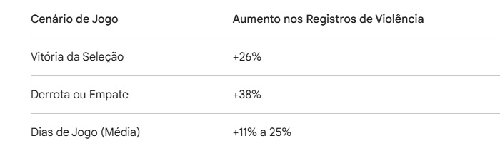 O fenômeno foi detalhadamente mapeado pela Lancaster University, no Reino Unido. Ao analisar dados policiais durante a Copa do Mundo, os pesquisadores identificaram um padrão estatístico rigoroso: o aumento da violência ocorre independentemente do placar, mas a intensidade varia.